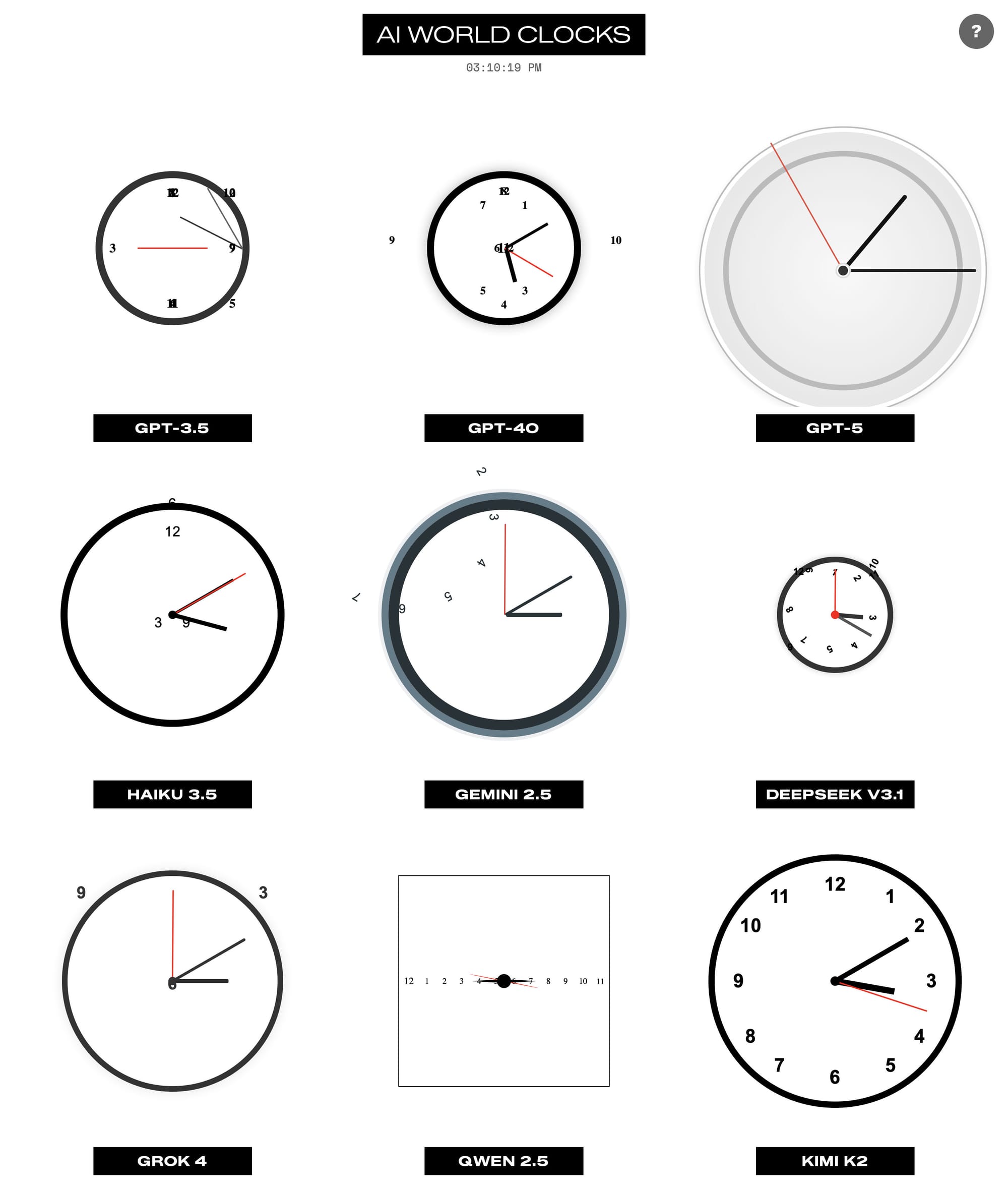 我看了几天,看起来 KIMI K2 和 DeepSeek V3.1 遵从指令比较好,尤其是 K2 每次看都是正确的,不过每次看起来都差不多,没那么好玩,其他几个模型基本是群魔乱舞,像极了刚学 CSS 时候的我hhhh